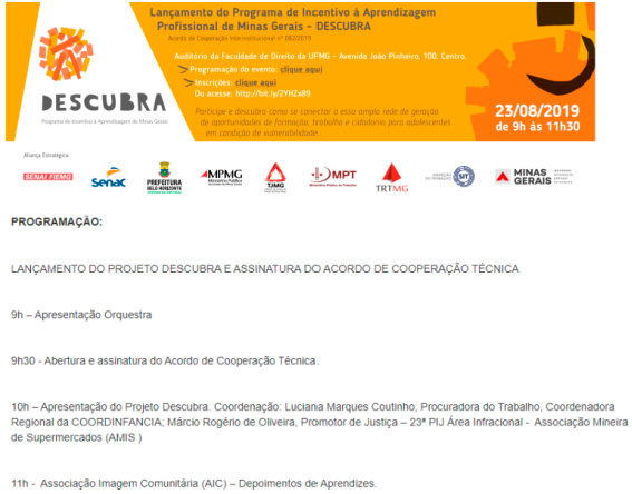 Como fruto das reuniões do programa, durante a Semana Nacional da Aprendizagem (dia 23/08/2019), foi lançado o Programa de Incentivo a Aprendizagem Profissional de Minas Gerais – DESCUBRA, na Faculdade de Direito da UFMG. Na oportunidade, foi realizada a assinatura do acordo de cooperação técnica entre os participantes do projeto.